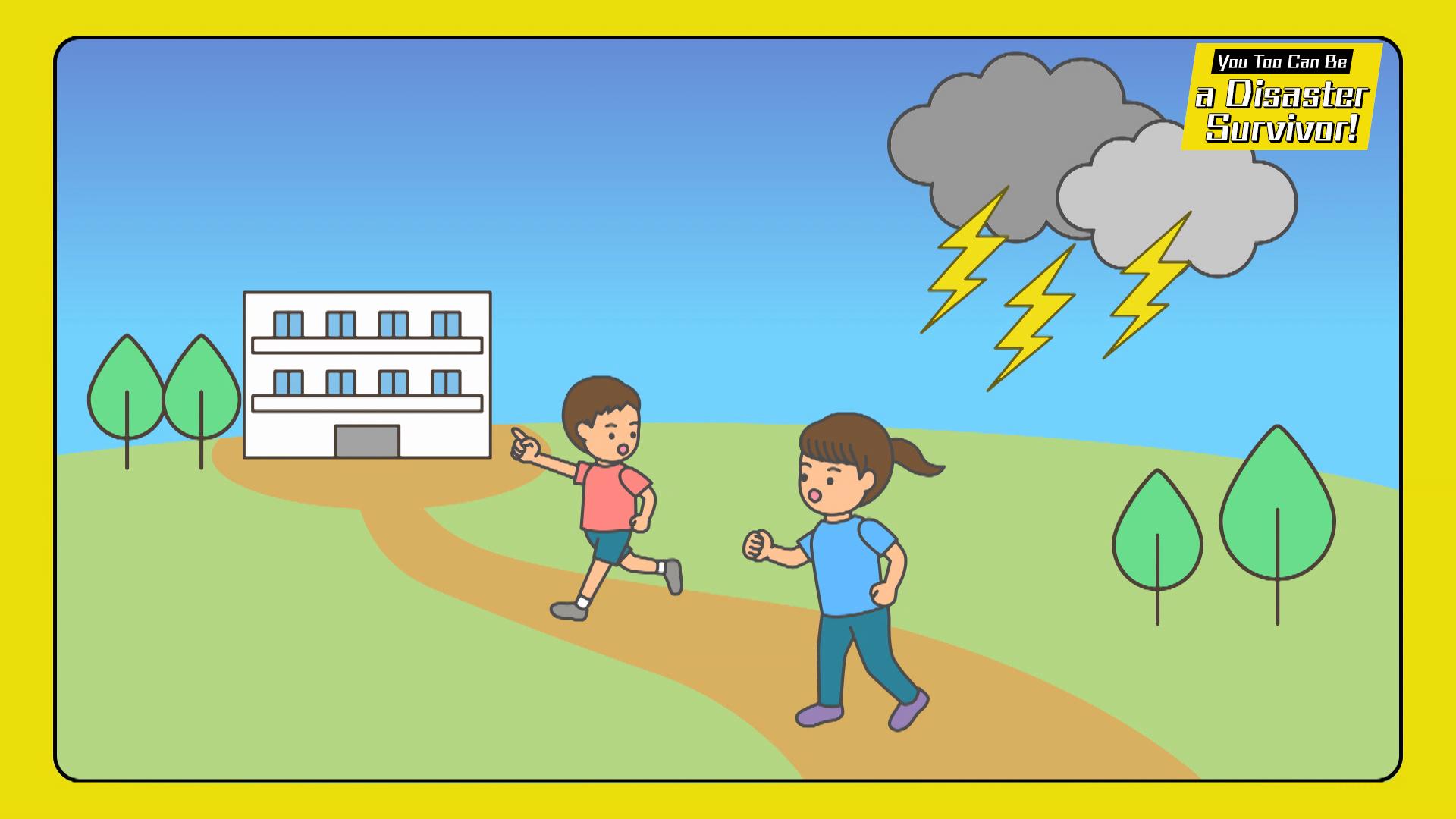anywhere. Disaster survivors are those who can protect themselves in any situation. In this episode, the theme is the danger of lightning strikes. Despite the high fatality rate, many accidents occur because people underestimate the danger. Elementary school students from Kumamoto, southern Japan, research the mechanism of lightning strikes and learn through guidance where they are likely to occur and what survival methods are appropriate in an emergency.
